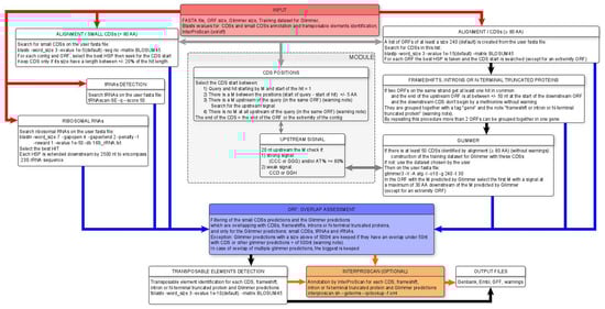 The details of the MicroAnnot algorithm are shown in Figure 3. Briefly, the complete set of Open Reading Frames (ORFs) of a given minimum size (default value 240 nt) is extracted from input FASTA sequence(s) and, after translation, is used as a query to perform an initial BLASTP analysis against well-annotated microsporidian proteomes incorporated in MicroAnnot, namely E. cuniculi, Nosema ceranae, Enterocytozoon bieneusi and Anncaliia algerae [16]. As some microsporidian genes exhibit a drastic size reduction, a second BLASTP analysis is performed after extracting all CDS sequences coding for short proteins (less than 80 amino acids, Figure 3 left part). For this second analysis, BLASTP parameters are optimized to identify sequence similarities between short peptide sequences and a specific database constructed from biologically and/or manually validated small gene sequences [15,16]. The significant results of the two BLASTP analyses are processed to optimize the identification of TISs, either by considering the alignment of the N-terminal part of the proteins or via the presence of transcriptional signals in the proximity of the start initiation codon when the N-terminal alignment is not available after local BLASTP alignment.