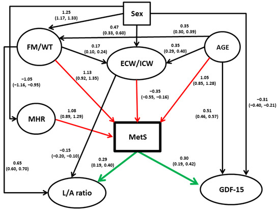 As seen, most covariates in the study were significantly dependent on sex and age. The most important links were, however, the direct connections found between MHR, ECW/ICW, FM/WT, and age with MetS. Interestingly, the effects of FM/WT on MetS appear to be linked not only directly but also indirectly via ECW/ICW. The latter association, however, is comparatively small and negative. The results also suggest that MetS causes both GDF-15 levels and L/A ratio and not vice versa.