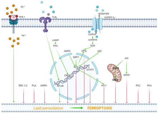 The role of kinases and transcription factors in the regulation of ferroptosis. Red arrows are inhibitors of ferroptosis, and green arrows are inducers of ferroptosis.