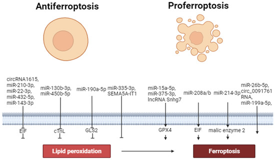 In recent years, much attention has been paid to studying the role of non-coding RNAs (ncRNAs), particularly microRNAs, long non-coding RNAs (lncRNAs), and circular RNAs in the pathogenesis of cardiovascular diseases, in particular, in the regulation of ferroptosis [60,61].