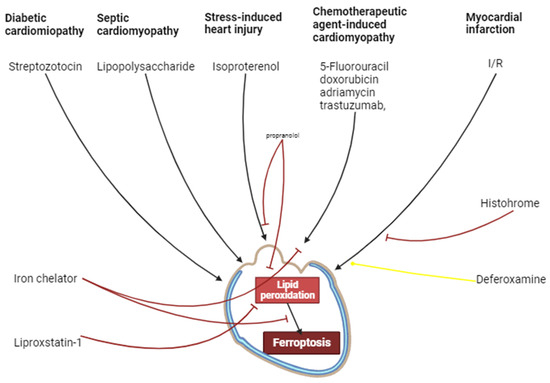 There is evidence that ferroptosis is involved in sepsis-induced cardiomyopathy [117]. Cecal ligation and puncture induces septic cardiomyopathy and ferroptosis in the murine myocardium [52,87]. Ferrostatin-1 alleviates septic cardiomyopathy and inhibits ferroptosis [87]. Lipopolysaccharide from Escherichia coli causes sepsis-like cardiomyopathy and ferroptosis in mice [17,19,24,71,81,118]. Ferrostatin-1 alleviates LPS-induced cardiomyopathy and inhibits ferroptosis [24,71,87,118]. The Fe2+ chelator dexrazoxane also mitigates LPS-induced cardiomyopathy and suppresses ferroptosis [118]. LPS causes cell death and the ferroptosis of H9c2 cells and neonatal rat cardiomyocytes [119].