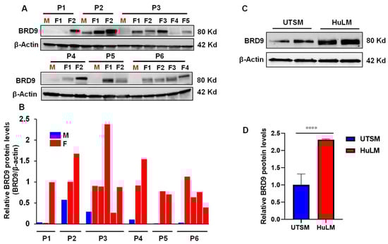 We first measured the levels of BRD9 protein in human UFs (n = 17, UFs from 6 patients) and matched myometrial tissues (n = 6). The uterus from each case (cases 1–6) contains multiple UFs. As shown in Figure 1A,B, among 17 UFs analyzed, 81% (15/17, p < 0.01) exhibited the upregulation of BRD9 compared to matched myometrium. The BRD9 levels showed differences between UFs from the same uterus. For example, the expression levels of BRD9 in UF#2 are much higher than those of UF#1 for case 1. Similar findings can be observed for other cases, suggesting a heterogeneous characteristic of UFs regarding BRD9 expression. In addition, the expression of BRD9 showed a marked upregulation in the UF cell line (HuLM) compared to the myometrial cell line (UTSM) (Figure 1C,D), suggesting the aberrant BRD protein expression may contribute to the pathogenesis of UFs (p < 0.0001).