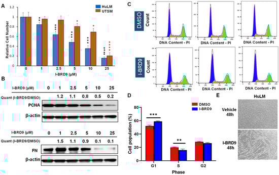 To determine the anti-proliferative effect of BRD9 inhibitors on UF cell proliferation, we selected I-BRD9 (the potent BRD9 inhibitor) in our in vitro cell model to assess its impact on UF cell growth. To determine if I-BRD9 affects UF cells and myometrial cells, a trypan blue exclusion assay was performed in HuLM and UTSM cell lines treated with dose ranges from 1–25 µM. Treatment with BRD9 inhibitor (I-BRD9) for 48 h showed a dose-dependent inhibitory effect on the proliferation of UF and myometrial cells (Figure 2A). Notably, I-BRD9 inhibited HuLM cell proliferation in a 1–25 µM dose range. In contrast, I-BRD9 inhibited UTSM cell proliferation in a dose range of 5–25 µM. Moreover, at the same concentration of I-BRD9, a more inhibitory effect can be observed in HuLM cells than in UTSM cells. Overall, UF cells showed a more inhibitory effect on cell proliferation than myometrial cells (Figure 2A). In addition, we measured PCNA levels in response to I-BRD9 treatment within a concentration range of 1–25 µM in HuLM cells. As shown in Figure 2B (up panel), I-BRD9 treatment decreased PCNA levels in a dose-dependent manner, further demonstrating the antiproliferative effect of BRD9 inhibition. Next, to determine if the BRD9 inhibitor exerts an anti-fibrotic effect via decreasing extracellular matrix (ECM) protein levels, we measured fibronectin (FN) levels in the presence or absence of I-BRD9. Compared to vehicle control, I-BRD9 induced a dose-dependent decrease in FN protein levels (Figure 2B, lower panel).