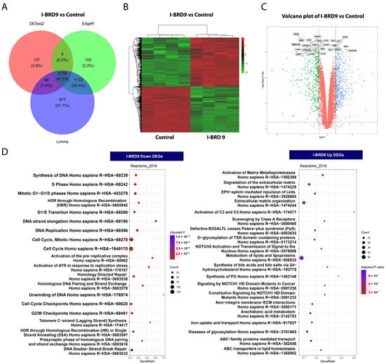 Treatment with I-BRD9 sculpts the transcriptome of UF cells. (A) Venn diagrams demonstrating the overlap of DEGs identified via three methods of Limma + voom, edgeR, and DESeq2 at Adjusted p-value cut off 0.05 and −1.5 > log2FC > 1.5 for I-BRD9 vs. control. (B) Heatmap of I-BRD9 vs. control (DMSO) group. (C) Volcano plots of the gene expression profiles of I-BRD9 vs. control. (D) Reactome pathway analysis of DEGs. The dot plots show the top twenty enrichment terms associated with down DEGs (left panel) and up DEGs (right panel) in response to the I-BRD9 treatment. The x-axis represents the gene ratio, and the y-axis describes the enrichment components. The area of the cycle is proportional to the number of genes assigned to the term, and the color accords with the adjusted p-value.