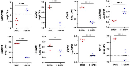 I-BRD9 altered cell cycle- and apoptosis-related gene expression in HuLM cells. RNA-seq revealed the downregulation of CCND1, CCND3, CDK2, CDK6, PCNA, and BCL-2, and upregulation of CDKN1C and CDKN1B. * p < 0.05; **** p < 0.0001.