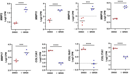 I-BRD9 altered the RNA expression of ECM-related genes in HuLM cells. RNA-seq revealed the upregulation of MMP2, MMP11, MMP15, MMP16, and MMP17 and downregulation of COL13A1, COL16A1, and Col17A1 in HuLM cells treated with I-BRD9. *** p < 0.001; **** p < 0.0001.
