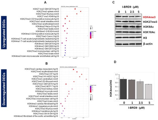 Enrichment analysis for histone modifications. The dot plots showed the top twenty enrichment terms for histone modification associated with up DEGs (A) and down DEGs (B) in response to I-BRD9 treatment. The x-axis represents the gene ratio, and the y-axis describes the enrichment components. The area of the circle is proportional to the number of genes assigned to the term, and the color accords with the adjusted p-value. (C) The levels of histone marks, including H3K4me3, H3K27me3, H3K9Ac, and H3K18Ac, were examined via immunoblot analysis in HuLM cells in the presence (I-BRD9 (1–5 µM) or absence (DMSO) of I-BRD9. (D) The levels of H3K4me3 were quantified in HuLM cells in the presence or absence of I-BRD9 using NIH Image J.