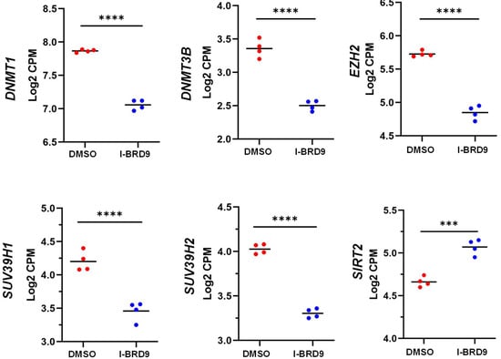 We performed targeted gene analysis using our RNA-seq data and found that the RNA expression of several epigenetic genes was altered in response to I-BRD9 treatment. These altered genes included EZH2, SUV39H1, SUV39 H2, DNMT1, DMMT3B, and SIRT2 (Figure 7). We also validated the expression of several epigenetic genes via q-PCR, and the results are consistent with RNA-seq data (Figure S3C). These analyses suggest that I-BRD9 treatment may alter the transcriptome via multiple epigenetic mechanisms.