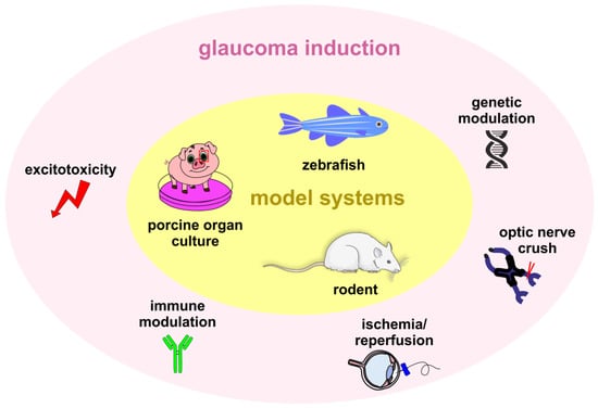 Model systems and induction methods to create glaucoma animal models without chronic IOP elevation. Zebrafish, rodents such as mice and rats, and porcine organ cultures can be used to simulate glaucoma-like damage. To induce glaucoma-like damage in porcine organ cultures of the eye (red box), different excitotoxicity-based substances can be used. In zebrafish, in addition to the excitotoxicity-based substances, genetic modulations can also be carried out to create an NTG model. In rodents, the opportunities range from excitotoxicity-based substances, genetic and immunomodulatory modifications, as well as ischemia/reperfusion induction to optic nerve crush.