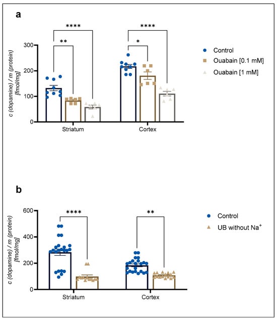 Inhibition of (a) 30 nM concentration of [3H]-DA uptake by 0.1 mM and 1 mM concentration of ouabain and (b) 30 nM concentration of [3H]-DA uptake in uptake buffer (UB) without Na+ in cortical and striatal astrocytes from neonatal rats. Results are presented as percent of the control; each bar expressed as mean ± SEM from three or more separate experiments ((a): n = 9, (b): n = 22). Statistical significance of reduction of DA uptake in comparison to the control was determined by One-Way ANOVA: * p < 0.05, ** p < 0.01, **** p < 0.0001. Difference between cortical and striatal DA uptake was nonsignificant (Student t-test, p > 0.05).