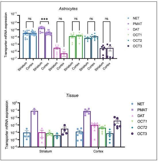 mRNA expression of transporters NET, PMAT, DAT, OCT1, OCT2, and OCT3 in striatal and cortical astrocytes cultured from neonatal rats (Astrocytes) as well as in striatal and cortical tissue samples of neonatal rats (Tissue). mRNA expression is normalized to the mRNA expression of the endogenous control, β-actin. Data are presented as mean ± SEM (astrocytes: n ≥ 6, from at least two separate experiments, tissue: n ≥ 4 from 4–6 animal tissue samples). Statistical analysis of comparative mRNA expression of transporters between striatal and cortical astrocytes (Astrocytes), was performed by multiple unpaired Mann–Whitney U tests with multiple testing correction two-stage step-up (Benjamin, Kriger, and Yekutieli) to control the false discovery rate (FDR) *** p = 0.001, ns—nonsignificant.