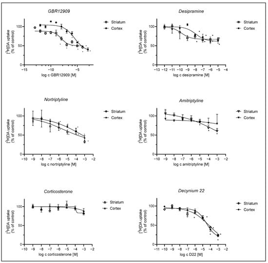 Inhibition of [3H]-DA uptake by GBR12909, desipramine, nortriptyline, amitriptyline, corticosterone, and D22. Astrocytes were preincubated with various compounds for 20 min, which was followed by a 20 min incubation with 30 nM [3H]-DA at 37 °C. Results are presented as percent (mean ± SEM) of the total [3H]-DA uptake of the control from three to four separate experiments carried out in triplicates (n ≥ 9). IC50 and pIC50 (calculated as the negative log of the corresponding IC50 values) of compounds inhibiting the total [3H]-DA uptake into cultured adult rat astrocytes were calculated from the corresponding inhibition curves. GBR12909: cortex: IC50 = 2.97 ± 2.46 µM, pIC50 = 5.5, striatum: IC50 = 0.00956 ± 0.00571 µM, pIC50 = 8.0, desipramine: cortex IC50 = 0.0125 ± 0.0137 µM, pIC50 = 7.9, striatum: IC50 = 0.000157 ± 0.000223 µM, pIC50 = 9.8; nortriptyline: cortex ns, striatum: IC50 = 3.5 ± 32.1 µM, pIC50 = 5.5, amitriptyline: ns, corticosterone: cortex and striatum: ns, D22: cortex—IC50 = 30 ± 17 µM, pIC50 = 4.5, striatum—IC50 = 81 ± 235 µM, pIC50 = 4.1. Statistical analysis of the difference in DA uptake in comparison to the control was carried out using an unpaired t-test with Welch control, * p < 0.05.