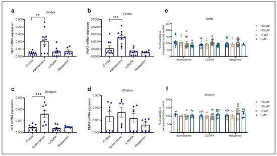 Changes in mRNA expression of transporters NET (a,c) and PMAT (b,d) after 24 h treatment with apomorphine, L-DOPA, and haloperidol. Data are presented relative to the expression of endogenous control, β-actin, as mean ± SEM of at least two separate experiments ((a,b): n = 9; (c,d): n = 7). Statistical analysis was performed using One-Way ANOVA with post-hoc Dunnett’s test (Cortex: NET: F(3,30) = 6.701, p = 0.0014, PMAT: F(3,30) = 13.88, p < 0.0001; striatum: NET: F(3,24) = 10.98, p < 0.0001, PMAT: F(3,24) = 1.392, p = 0.2695); ** p = 0.0013, *** p < 0.001. Cell viability of cortical (e) and striatal (f) astrocytes after 24 h treatment with various concentrations (1, 10, 100, 150 µM) of apomorphine, L-DOPA, and haloperidol presented as percent of the control, mean ± SEM ((e): n = 16, 4 separate experiments, (f): n = 12, 3 separate experiments). Differences in cell viability between treatments and control were determined as nonsignificant by One-Way ANOVA with post-hoc Dunnett’s test, p > 0.05.