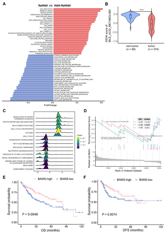 Characteristics of bile acid metabolism in hepatocellular carcinoma (HCC). (A) Alteration pathways in the samples from the tumor (n = 374) versus non-tumor (n = 50) samples of TCGA-LIHC cohort. Upregulated and downregulated pathways are indicated in red (right) and blue (left) bars. Foldchange was calculated using the R package “limma (v. 3.58.1)”. (B) Gene set variation analysis (GSVA) showed that bile acid metabolism was downgraded in HCC compared to the non-tumor samples. In the violin plots, the middle bar represents the median, and the box represents the interquartile range (the 25th and 75th percentiles); the vertical line denoted 1.5 times the interquartile range. p-values are calculated via the Wilcoxon rank-sum test (**** p < 0.0001). The results of GSEA analysis illustrated in (C) the top 15 pathways with the largest |NES| and (D) BA metabolism-related gene set enrichment. Kaplan–Meier curves of overall survival (OS) (E) and disease-free survival (DFS) (F) for BAMS-high and BAMS-low of TCGA-LIHC cohort.