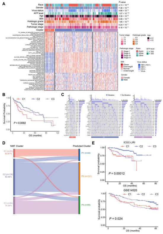Subtypes of 368 HCC samples and association with clinical characteristics. (A) Heat map of alteration pathways in three subtypes identified via non-negative matrix factorization (NMF) consensus clustering (tumor samples, n = 368): C1 (red, n = 51), C2 (blue, n = 190), and C3 (purple, n = 127). Clinical characteristics are shown above with p-values calculated using a chi-square test. Underweight: body mass index (BMI) <18.5; normal: 18.5 ≤ BMI ≤ 25; overweight: 25 < BMI ≤ 30; obese: BMI > 30. (B) Kaplan–Meier curves of OS for each subtype of TCGA-LIHC cohort. (C) Oncoprint of gene mutation in the three subtypes of TCGA-LIHC cohort, purple for mutation and grey for no mutation. (D) Comparison of subtypes between NMF clusters and predicted clusters of ICGC-LIRI cohort depicted in the Sankey diagram. The height of each linkage line represents the number of samples. (E) Kaplan–Meier curves of OS for subtypes identified by NMF in the ICGC-LIRI cohort (top) and predicted subtypes in GSE14520 (bottom).