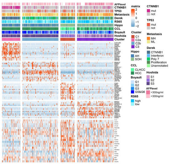 Given that the above three subtypes were classified via BA metabolism-related genes, and that C1 and C3 were characterized as proliferative HCC, we then further addressed whether there were subtypes with differential expression patterns of BA metabolism-related genes among C2 belonging to the non-proliferative HCC. C2 was divided into two subtypes, named C2a (n = 64) and C2b (n = 126). A heat map displays the top 15 DEGs for each subtype and the correlation with previous classifications (Figure 3). C2a was significantly correlated with Chiang’s CTNNB1 subclass and had the highest frequency of CNTTB1 mutation (p < 0.001). C2, with the most favorable prognosis, exhibited similarity to the active Hippo (AH) pathway subgroup [18], CCL’s HCC subclass [19], CTNNB1 activating mutations subclass (Boyault’s G5/G6) [20], and the well-differentiated subclass (Hoshida’s S3) [21]. C1 and C3 were more correlated with metastasis high risk (MH) [22], Derek’s proliferation subclass [23], high risk scores of 65-genes (RS65, high) [24], silencing of the Hippo pathway (SOH), and cholangiocarcinoma-like HCC (CLHCC), suggesting that HCC with the C1/C3-like gene expression pattern represents a poor outcome and a more aggressive tumor (Figure 3).