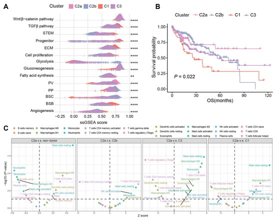 We then assessed the correlation of specific HCC signatures across the four subtypes. As was described previously, C2 was enriched in the metabolism of BAs, fatty acids, and amino acids, which share similar patterns with PP (periportal)-type and PV (perivenous)-type HCCs [25] (Figure 2A). Particularly, C2a presented the highest PV score, which is in line with the study that showed that the PV-type HCCs exhibited a higher mutation frequency of CTNNB1 [25]. By contrast, C1 and C3 showed comparable characteristics as the proliferative HCC, with TGFβ activation, stem cell features, cell cycle progression, higher vascular invasion, and poor prognosis. C2a and C2b had a higher score of bile salt efflux into canaliculi (BSC) than other subtypes, while C1 was most enriched in the bile salt efflux into blood flow (BSB) signature, implying that more bile salts in C2 samples efflux into bile canaliculi and may cause cholestasis [20] (Figure 4A). Also, survival analysis was significantly different among the four subtypes (p = 0.022, Figure 4B).