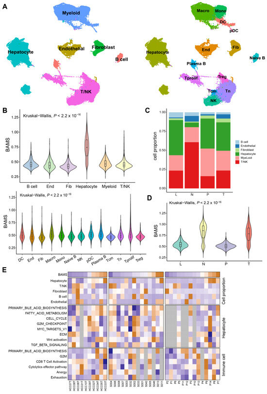 Single-cell RNA sequencing (scRNA-seq) analysis of HCC patients regarding BAMS in GSE149614. (A) The uniform manifold approximation and projection (UMAP) plot of major cell types (left) and subclusters (right). Macro: Macrophage; Mono: Monocyte; DC: Dendritic cell; pDC: Plasma dendritic cell; End: Endothelial cell; Fib: Fibroblast; T prolif: Proliferation T cell; Tcm: Central memory T cell; and Tn: Naïve T cell. (B) Violin plot of BAMS in major cell types (top) and subclusters except for hepatocytes (bottom). The statistical difference was compared via the Kruskal–Wallis test. (C) Stacked bar plots showing the percentages of major cell types in each tissue type. L: MLN metastatic lymph node; N: non-tumor liver; P: portal vein tumor thrombus; T: primary tumor. (D) Violin plot described the BAMS of hepatocytes in each tissue. (E) Clustered heatmap of related signatures across three datasets (GSE149614, GSE151530, and GSE156625). The samples are ordered by BAMS from the lowest to the highest from the color blue to orange, respectively. Grey rectangles indicate that the number of cells in the sample is less than 50.