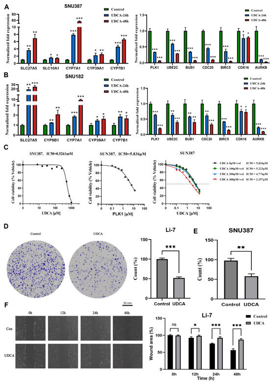 The IC50 of UDCA was determined in SNU387 cells as 0.5261 mM after 24 h of exposure across various concentrations (Figure 6C, left). Polo-like kinase 1 (PLK1) is a serine/threonine protein kinase involved in cell cycle regulation, and aberrant PLK1 signaling has been implicated in various cancers, including HCC [30]. To assess the antitumor activity, we combined UDCA with one PLK1 inhibitor (Volasertib). The IC50 of the PLK1 inhibitor was identified as 5.836 µM in SNU387 cells after 24 h of exposure across a concentration range (Figure 6C, middle). The results from the CCK8 assay indicated that the combination therapy (UDCA and Volasertib) exhibited a superior effect compared to monotherapy (Figure 6C, right). Moreover, we also found that UDCA repressed colony formation in several HCC cell lines (Figure 6D,E, Supplementary Figure S6C,D). The wound-healing experiment illustrated that UDCA slowed cell migratory ability compared to the control (Figure 6F, Supplementary Figure S6E–G).