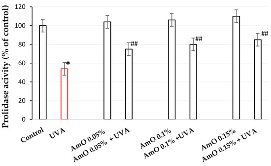 Prolidase activity in fibroblasts irradiated with UVA and treated with AmO at concentrations of 0.05%, 0.1%, and 0.15% vs. the control. The mean ± standard error (SEM) values from the experiments performed in triplicates. * Statistically significant differences at p < 0.05 compared with the control. ## Statistically significant difference at p < 0.05 compared to UVA (red bar).