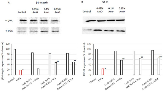 Western blot and densitometry (completed using ImageJ® 1.8.0) for β1-integrin receptor (A) and IGF-IR (B) from 3 pooled homogenates of UVA-irradiated fibroblasts cultured in the presence of AmO at concentrations of 0.05%, 0.1%, and 0.15% vs. the control. * Statistically significant differences at p < 0.05 compared with the control. ## Statistically significant difference at p < 0.05 compared to UVA (red bar).