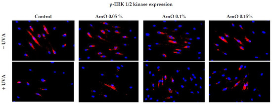 Expression of p-ERK 1/2 kinase (visualized using immunofluorescence staining) in fibroblasts irradiated by UVA and treated with AmO at concentrations of 0.05%, 0.1%, and 0.15% vs. the control. Blue staining indicates the nuclei and red staining represents ERK 1/2 expression. The images were obtained at a 20× magnification.