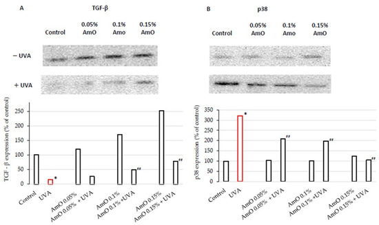 Western blot and densitometry (completed using ImageJ® 1.8.0) for TGF-β (A) and p38 (B) from 3 pooled homogenates of UVA-irradiated fibroblasts cultured in the presence of AmO at concentrations of 0.05%, 0.1%, and 0.15% vs. the control. * Statistically significant differences at p < 0.05 compared with the control. ## Statistically significant difference at p < 0.05 compared to UVA (red bar).