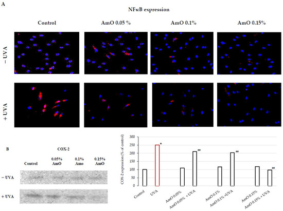 (A) Expression of NFκB (visualized using immunofluorescence staining) in fibroblasts irradiated by UVA and treated with AmO at concentrations of 0.05%, 0.1%, and 0.15% vs. the control. Blue staining indicates the nuclei and red staining represents NF-κB expression. The images were obtained at a 20× magnification. (B) Western blot and densitometry (completed using ImageJ® 1.8.0) for COX-2 from 3 pooled homogenates of UVA-irradiated fibroblasts cultured in the presence of AmO at concentrations of 0.05%, 0.1%, and 0.15% vs. the control. * Statistically significant differences at p < 0.05 compared with the control. ## Statistically significant difference at p < 0.05 compared to UVA (red bar).