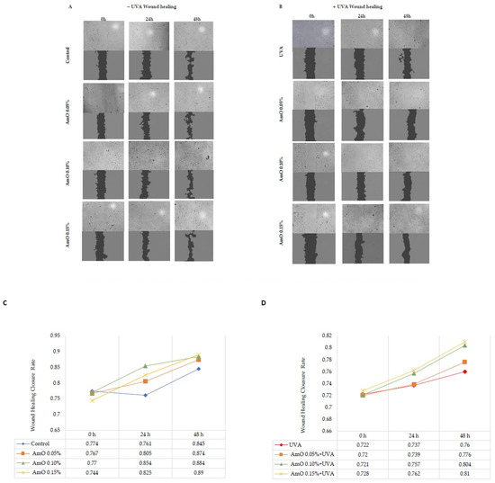 Wound healing images in (A) non-UVA-irradiated fibroblasts, treated for 24 h and 48 h with AmO at concentrations of 0.05%, 0.1%, and 0.15%, and (B) UVA-irradiated fibroblasts, treated for 24 h and 48 h with AmO at concentrations of 0.05%, 0.1%, and 0.15%. The wound healing closure rate was calculated and analyzed using ImageJ®1.8.0 software in (C) non-UVA-irradiated fibroblasts, treated for 24 h and 48 h with AmO at concentrations of 0.05%, 0.1%, and 0.15%, and (D) UVA-irradiated fibroblasts, treated for 24 h and 48 h with AmO at concentrations of 0.05%, 0.1%, and 0.15%.