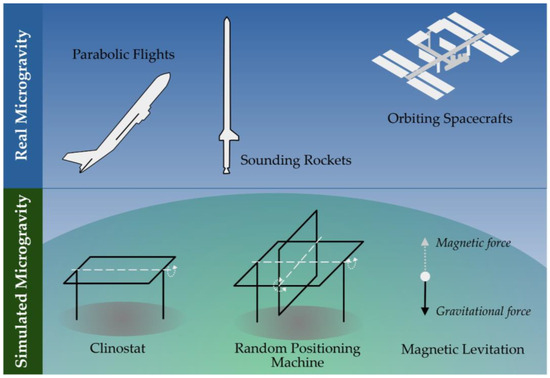 Due to the costly nature and long turnaround times of space-flown experiments, multiple ground-based µg-simulation devices are in use (Figure 3) [50,51]. It is important to state that none of these µg-simulation devices create a true µg-environment in a physical sense. However, they are valuable tools for pre- and post-flight experiments and ground tests during hardware development. Despite the fact that some space-flown experiments were reliably reproduced on µg-simulation devices, results from s-µg should always be discussed critically in the context of confounding factors that could jeopardize a true µg effect [60,61].