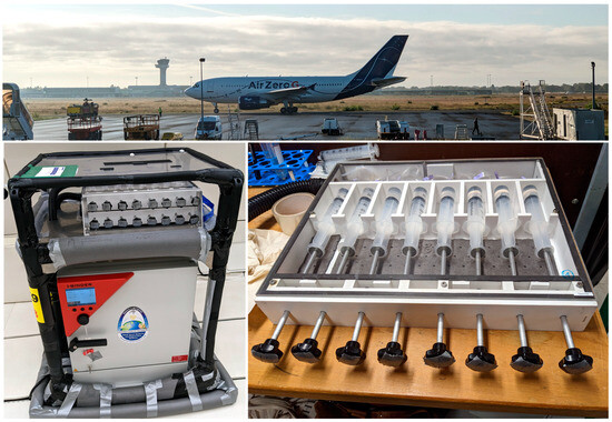 Impressions of the 41st DLR parabolic flight campaign in September 2023, Bordeaux, France. The Airbus A310 Zero G aircraft of Novespace (top), the flight rack of the “Thyroid” mission (bottom left) and its RNAlater injection system (bottom right) are shown.