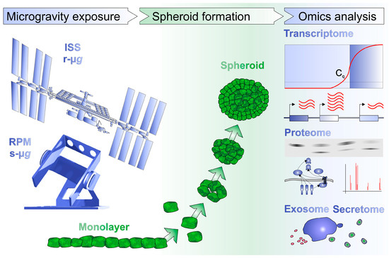On the first of November 2011, the Shenzhou-8 spacecraft was launched from the Jiuquan Satellite Launch Center in Northern China. On board were FTC-133 cells from which spheroids were grown during the mission in r-µg and in an automated culture system (ACS) [156]. Pietsch et al. studied the regulation of EGF and CTGF gene expression in r-µg (ACS) and s-µg (RPM) under the same unusual temperature conditions (23 °C) that were specified by the space mission. They observed an increased EGF and CTGF expression under r-µg and s-µg. From the similar MCS and AD expression pattern, the authors conclude that there is increased evidence for the role of the two growth factors in the transition of thyroid cancer cells from 2D to 3D growth. The study by Ma and coworkers [42] is dedicated to the integration of effects of short-term µg exposure (PF) with experiments of longer-term µg exposure (Shenzhou-8 space mission) based on the thyroid tumor cell line FTC-133. They found that key genes involved in tumor cell proliferation and metastasis formation (e.g., IL6, CXCL8, IL15, OPN, VEGFA, VEGFD, FGF17, MMP2, MMP3, TIMP1, PRKAA, and PRKACA) in the Shenzhou 8 space mission responded similarly to µg in subsequent ten-d RPM experiments in an antiproliferative manner with often opposite effects in PF. The authors emphasized the benefit of accompanying s-µg experiments. Accordingly, Warnke et al. [157] subsequently investigated the frequently used s-µg-platforms 2D clinostat and RPM in their effect on spheroid development and accompanying expression changes in 16 genes (qPCR). The expression depletion of CAV1 and CTGF in MCS compared to adherent cells was observed on both machines. This led the authors to the conclusion that both platforms mimic spheroid formation physiologically sufficiently similar to r-µg conditions.