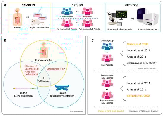 To provide a deeper insight into the research about TGF-β1 in fibrosis, the study design, the patient or sample groups that were compared, the techniques used to detect TGF-β1 (Figure 1A), and whether the analysis was carried out at the pre-transcriptional or post-translational level were then analyzed. The experimental designs consisted of determining TGF-β1 mRNA and protein by quantitative methods in human esophageal samples, comparing patients and controls, as well as patients with active EoE versus inactive disease (Figure 1B). Overall, five publications included a more complete study design to determine whether TGF-β1 was involved in EoE fibrosis (Figure 1C), since they were carried out on human samples using quantitative methods.