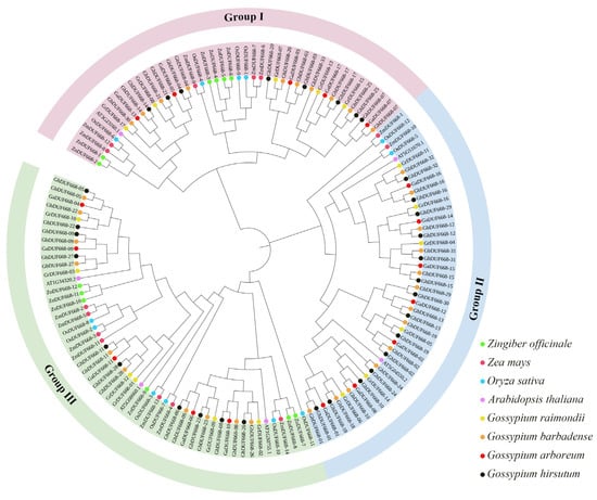 The hidden Markov model file of the DUF668 protein (PF05003) was downloaded from Pfam database (http://pfam.xfam.org/, accessed on 15 October 2023) []. Then, the protein sequence database of ginger was searched by BLASTp (e-value < 1 × 10−5) to obtain the candidate protein for ZoDUF668. The DUF668 protein domain of ginger was further identified using Pfam (v35.0, http://Pfam.xfam.org/, accessed on 15 October 2023) and InterProScan (v94.0, http://www.ebi.ac.uk/InterProScan/, accessed on 15 October 2023) databases, eliminating repetitive, redundant, and incompletely annotated sequences []. The ClusterW multiple sequence alignment was performed on six Arabidopsis thalian [], 12 Oryza sativa [], 14 Zea mays [], and 99 Gossypium [] DUF668 members using iTOL online tools (Interactive Tree of Life, http://ITOL.embl.de, accessed on 15 October 2023) []. Phylogenetic trees, including Z. officinale, A. thaliana, O. sativa, Z. mays, and Gossypium, were constructed through the neighbor-joining method (repeat value set to 1000) to illustrate the phylogenetic relationship between DUF668s and members of ZoDUF668s were classified and named based on the phylogenetic relationship [].