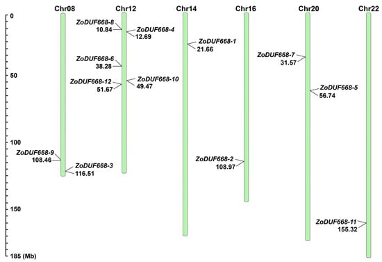 As can be seen in Figure 2, 12 ZoDUF668 genes are unevenly distributed on six chromosomes. Among them, Chr12 (Chromosome 12) has the highest number of genes, including five ZoDUF668 genes, followed by Chr8 and Chr20, both containing two ZoDUF668 genes, and the remaining chromosomes only contain one ZoDUF668 gene.