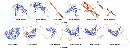 Ginger is an important spice crop, and its cultivation process is susceptible to various biotic and abiotic stresses []. Relevant research shows that that the DUF668 gene plays an important role in plant growth and development and stress responses []. Despite this, the classification, evolution, and function of this gene family in ginger have not been systematically studied. In this study, 12 ZoDUF668s were identified from the ginger genome and separated into two subfamilies according to the phylogenetic tree branches and designated as ZoDUF668-1 to ZoDUF668-12.