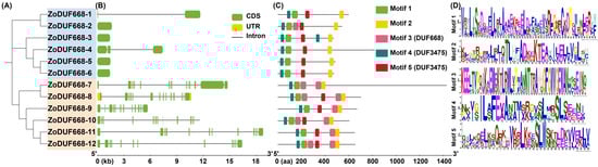 According to GFF3 gene structure annotation information, the gene exon/intron structure map of ZoDUF668s was drawn using TBtools []. Conservative motifs were analyzed using MEME (https://meme-suite.org/meme/, accessed on 15 October 2023), parameter setting: the width of motifs ranged from 6 to 50 aa; any number of repetitions; the maximum fundamental number was 5. Then, the conserved motifs were visualized by TBtools [].