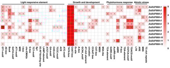 Analysis of cis-elements in promoter regions of ZoDUF668 genes.