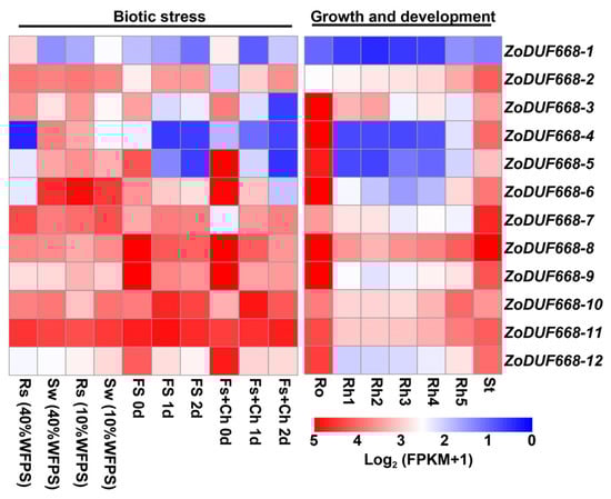 The expression patterns of the ZoDUF668 gene at different growth stages and stress were analyzed using the RNA-seq data of ginger. As shown in Figure 6, ZoDUF668s respond to various biotic stresses. For instance Fusarium solani and Ralstonia solanacearum infection, ZoDUF668-2, ZoDUF668-7, ZoDUF668-10, and ZoDUF668-11 were highly expressed under F. oxysporum after 1 d, while ZoDUF668-1, ZoDUF668-5, ZoDUF668-6, ZoDUF668-8, ZoDUF668-9, and ZoDUF668-12 rapidly decreased with the increase in inoculation time. Under F. solani and chitosan, ZoDUF668-2, ZoDUF668-7, and ZoDUF668-11 increased with the increase in inoculation time; ZoDUF668-1, ZoDUF668-3, ZoDUF668-7, ZoDUF668-8, and ZoDUF668-11 were highly expressed under R. solanacearum infection (40% water-filled pore space), and ZoDUF668-2, ZoDUF668-5, ZoDUF668-6, and ZoDUF668-8 were highly expressed under R. solanacearum treatment (10% water-filled pore space).