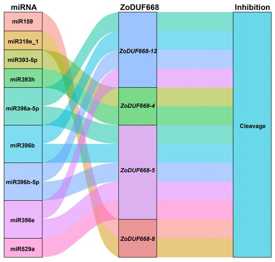 As can be seen from Figure 7, all nine miRNAs target four ZoDUF66s genes through the cleavage effect. Notably, ZoDUF668-8 was potentially targeted by two miRNAs, including miR159 and miR319e_1; miR529a regulates the expression of ZoDUF668-5; and miR396a_5p, miR396b, miR396b_5p and miR396e were predicted to target to ZoDUF668-5 and ZoDUF668-12 simultaneously. These results indicate that multiple miRNAs target ZoDUF668s and form a miRNA-mRNA regulatory network, participating in the post-transcriptional expression regulation of ZoDUF668s.
