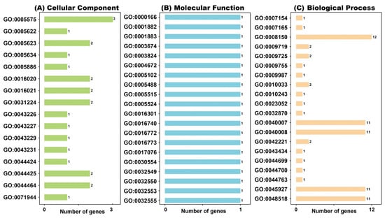 GO (Gene Ontology) analysis of the ZoDUF668 protein (Figure 8) showed that the biological pathways that the ZoDUF668 protein mainly participates in include cellular processes (3 ZoDUF668s), molecular functions (ZoDUF668-7), and single biological processes (12 ZoDUF668s). These ZoDUF668 proteins constitute cellular components, such as cells, organelles, membrane and so on. It is worth noting only ZoDUF668-7 exerts molecular function, including nucleotide binding (GO:0000166, GO:0001882), ATP binding (GO:0005524), and transferase activity (GO:0016740). In addition, the molecular functions of “response to stimulus (GO:0050896)”, “positive regulation of growth (GO:0045927)”, and “biological regulation (GO:0065007)” provide evidence of the involvement of ZoDUF668 in ginger growth and development, as well as its response to environmental stressors.