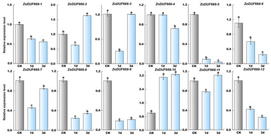 To obtain a comprehensive comprehension of the functional significance of ZoDUF668s in response to biotic stress, the expression patterns of 12 ZoDUF668s were analyzed using quantitative RT-qPCR in response to F. solani stress (Figure 9). The results showed that the expression levels of ZoDUF668-5, -6, and -12 continuously decreased within 3 days after treatment with F. solani. Among them, ZoDUF668-5 exhibited an expression level of only 4% compared to the CK at 3 days post-treatment. In contrast, the expression level of ZoDUF668-10 increased continuously over time, reaching 3.2-fold higher than the CK at 3 days post-treatment.