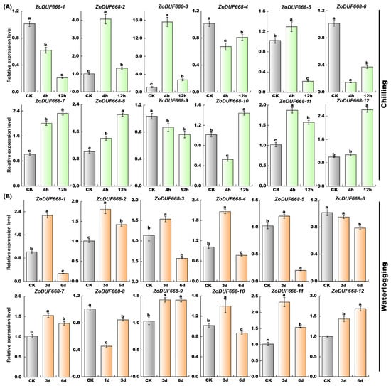 Analysis of ZoDUF668 expression under chilling and waterlogging stresses. (A) Chilling and (B) waterlogging stress. The y axis represents the relative expression level, and the x axis represents the time point after stress treatment. Each bar represents the average of nine replicates, and error bar represents standard deviation (SD), n = 9. Different letters in columns indicate significant differences between the treatments at p < 0.05 level.
