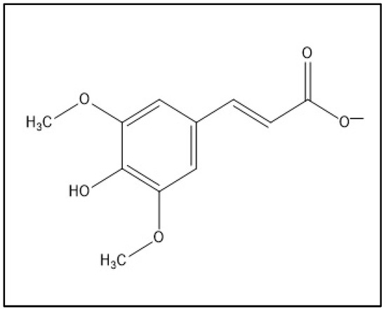 Sinapic acid (SA, 3,5-dimethoxy-4-hydroxycinnamic acid) is a naturally occurring hydroxycinnamic acid, found in plants, fruits, vegetables, several cereals, and oil crops [1,2,3,4] with potential use in food processing, cosmetics, and in the pharmaceutical industry. SA acts as an anti-inflammatory [5], antidiabetic [6], anticancer agent [7] with antioxidant [8], antibacterial [9], chemopreventive [10], neuroprotective [11], and antihypertensive [12] effects. At pH 7.4, SA is present as an anion (Figure 1), the COOH group (pKa = 4.47) being dissociated [13].