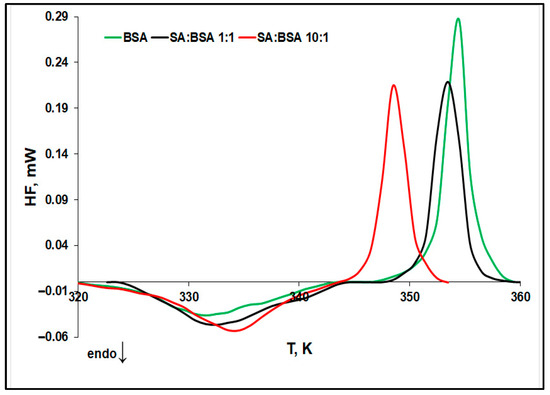 Ligand binding on protein modifies the protein thermal stability, and this effect could be estimated by μDSC measurements [31]. Figure 2 presents the μDSC sigmoid baseline subtracted thermograms of the protein, in the absence and presence of SA, allowing for the evaluation of the ligand concentration influence on BSA thermal stability.