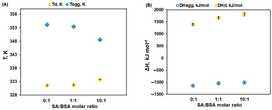 Thermodynamic parameters (A) temperatures and (B) enthalpies of BSA thermal denaturation and aggregation processes as a function of SA:BSA molar ratio. Standard deviations are presented as error bars.