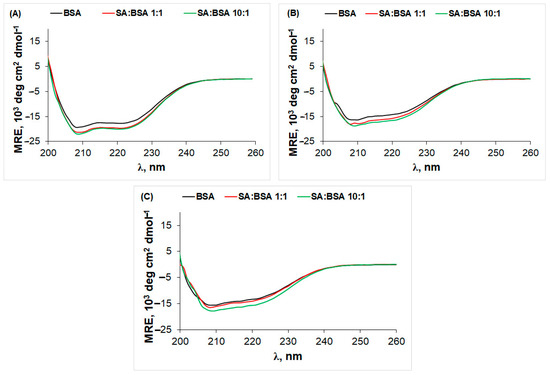 At 298 K, the protein secondary structure is predominantly α-helix, and SA presence induces an increase in the negative mean residue ellipticity (MRE) value, as a result of the ligand–protein interaction. The stabilization effect on the secondary structure of the protein, observed for both 1:1 and 10:1 SA:BSA molar ratios, could be correlated with μDSC data, where Td increases in the presence of the ligand. Similar results were obtained for the interaction of morin [25], caffeic acid [26], and caffeoylquinic acids [36] with BSA.