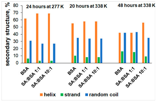 The secondary structure content of BSA and BSA–SA systems after incubation at 277 K and 338 K.