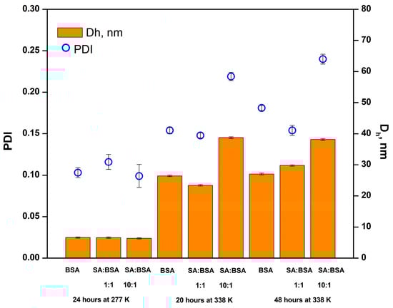 DLS measurements were carried out to determine the sizes of aggregates formed after incubating the protein samples in the absence and presence of SA. The intensity and number size distributions (Figures S2 and S3 from Supplementary Material) of the BSA solution at 277 K show a single population with the hydrodynamic diameter (Dh) value of 6.62 nm, corresponding to the native protein structure (monomeric form) which is in good agreement with the size of BSA reported in the literature [38]. In the presence of increasing concentrations of SA, no significant change in the Dh and polydispersity index (PDI) values could be observed (Figure 6).