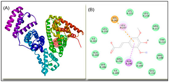 Molecular docking of SA and BSA; (A) SA is presented as stick and balls and the protein as solid ribbon. (B) The 2D representation of SA–BSA complex; the close amino acid residues are presented in green, dashed lines represent intermolecular interactions of different origin (electrostatic—orange line; π-alkyl—pink lines; π-σ—purple lines; π-π T-shaped—magenta lines; van der Waals interactions—light green lines).